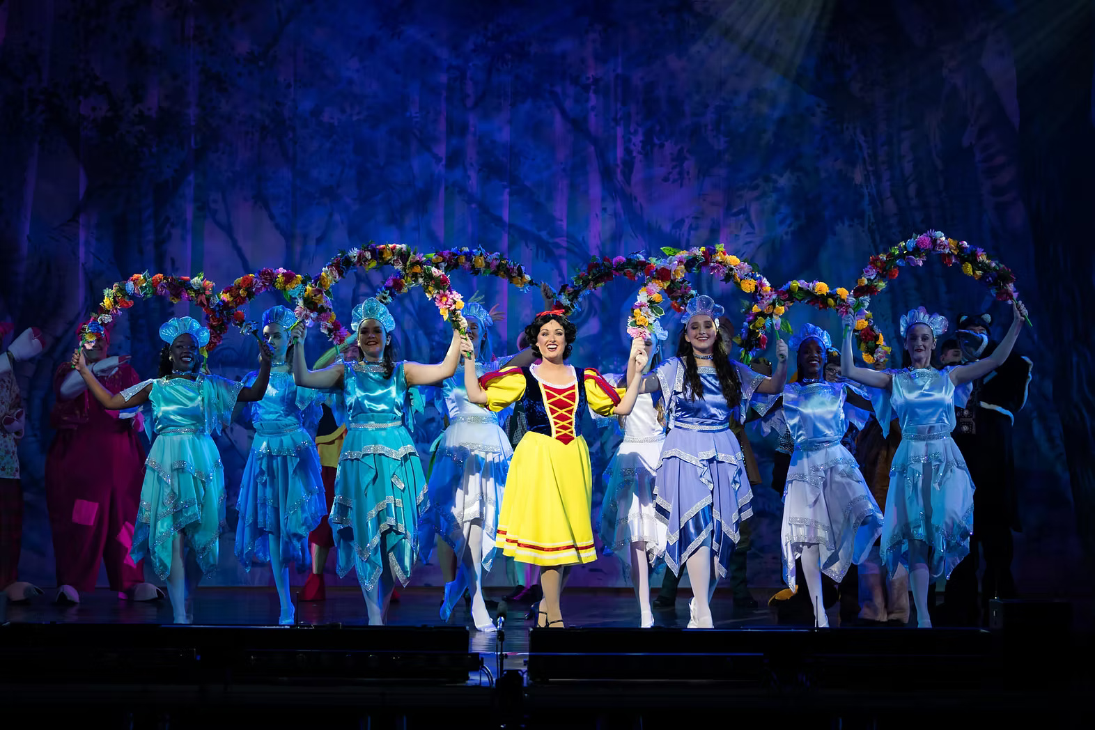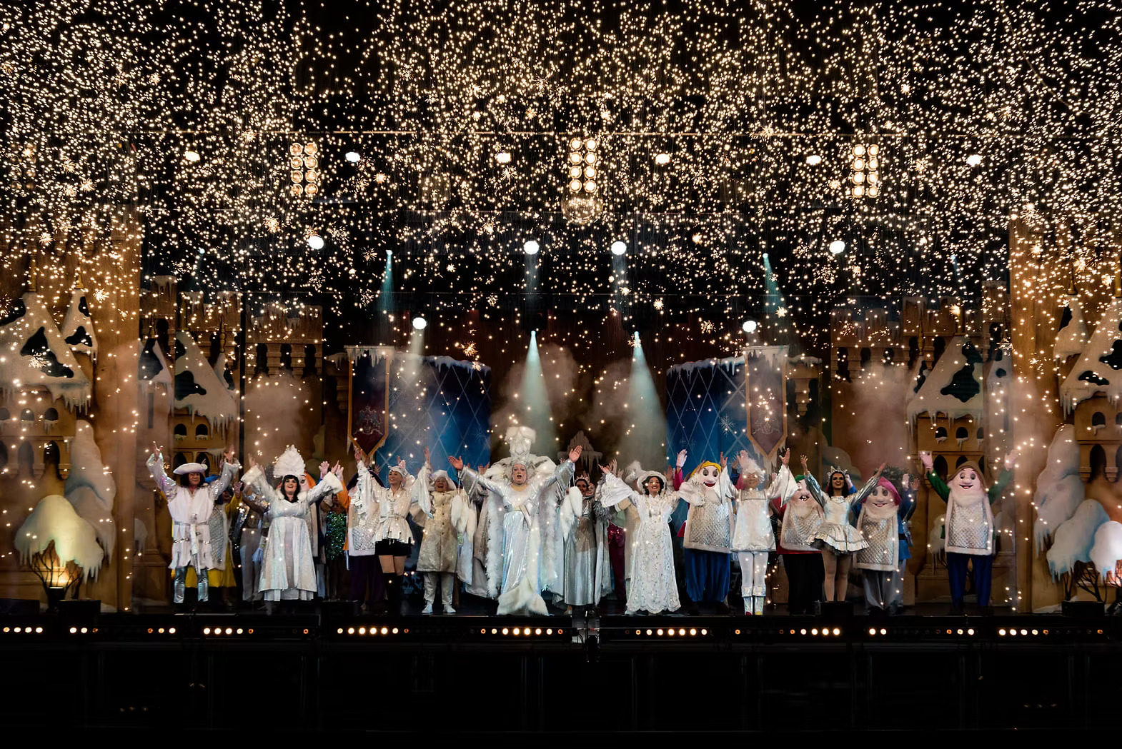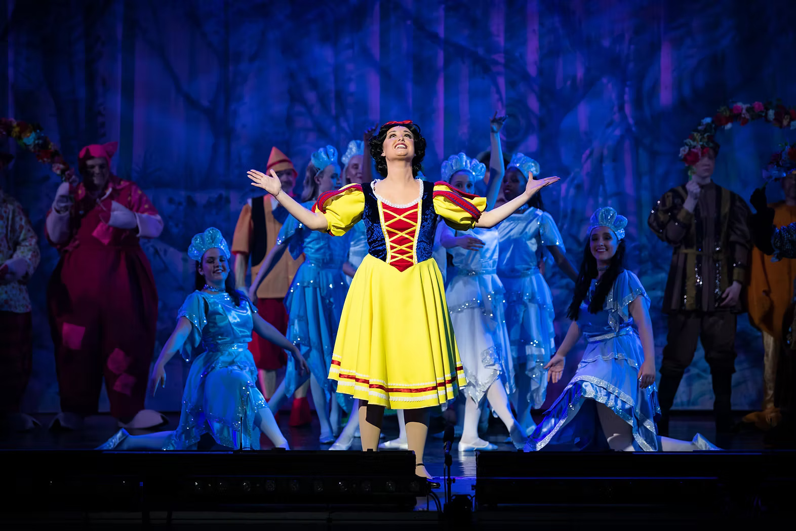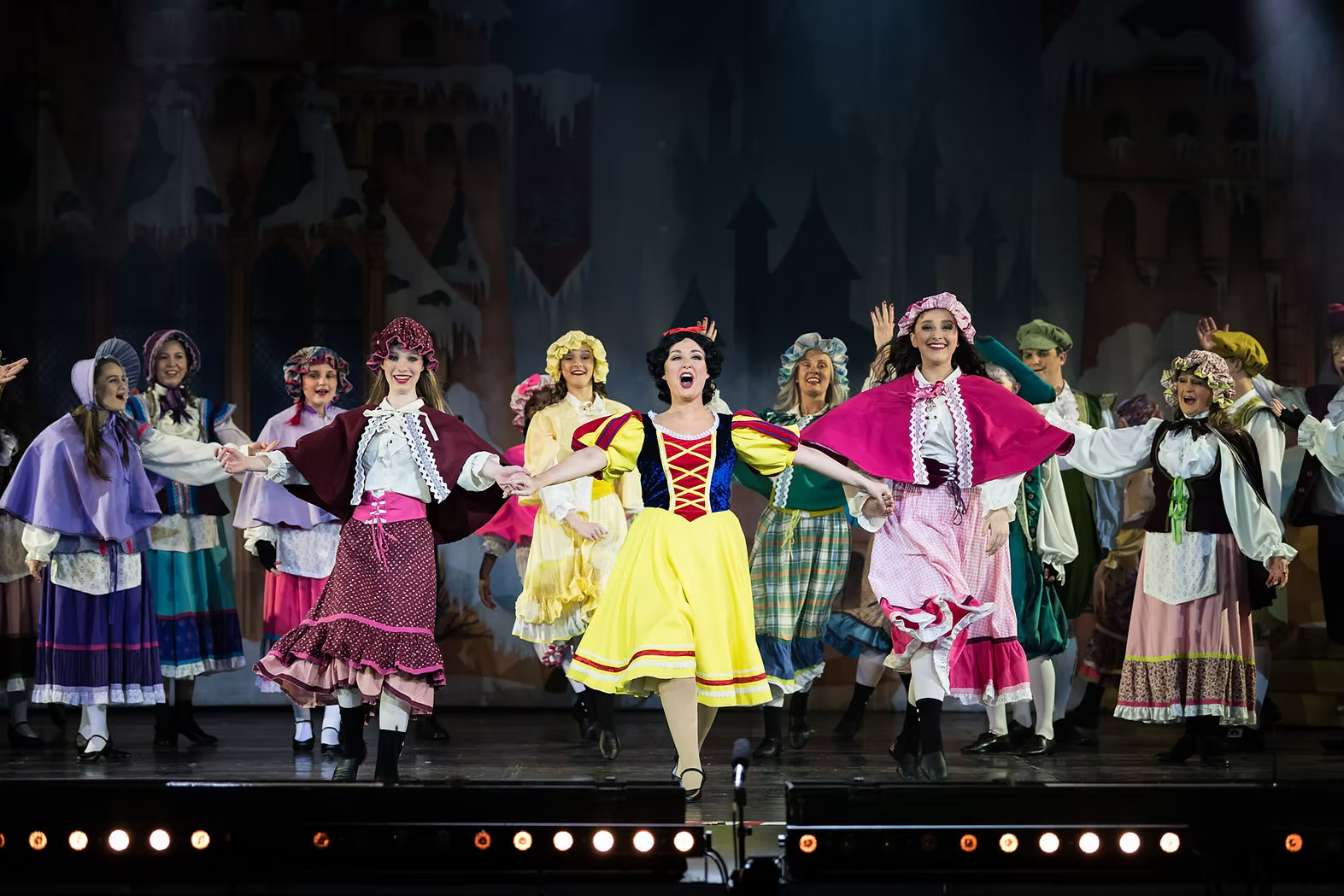 Molly Limpet’s can provide a variety of costume options for the popular Pantomime production of Snow White and the Seven Dwarfs. The images here show the company with a silver finale option, muted but colourful textured villagers, and a female principal boy in classic tunic style.